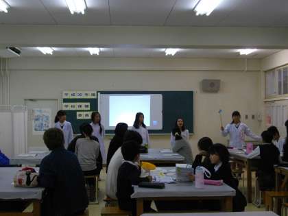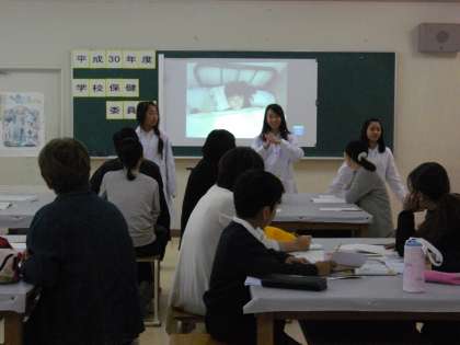 まず、養護教諭からは、本校児童へのアンケートの集計結果の発表があり、健康委員会の児童からは、テーマに関係する楽しい寸劇、また、クイズ形式で質問に答えさせるなど、発表の仕方に工夫がありました。特に、寸劇では、長いセリフもすべて覚えていたのでとても驚きました。