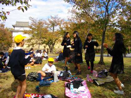 「ピースおおさか」を出てから、大阪城内でお弁当をたべました。11月だというのに大量の蚊が私たちを襲ってきたので、女子児童が蚊にさされないように、立ったままお弁当を食べていましたが、多くの児童が蚊の犠牲になりました。(写真では、女子児童が踊っているように見えますが。。)