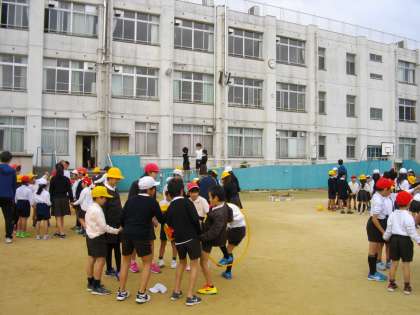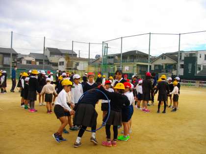 さて、今福小では、毎週木曜日に全校児童集会を行っていますが、集会委員の児童が企画・運営しています。本日11月15日は、運動場で1〜6年生児童が縦割り班に分かれて、「フラフープリレー」を行いました。高学年児童が、低中学年の児童をよくリードし、楽しそうに活動している様子を眺めていると、微笑ましく思います。
