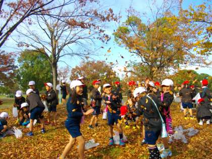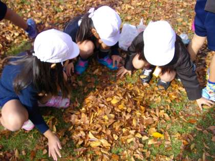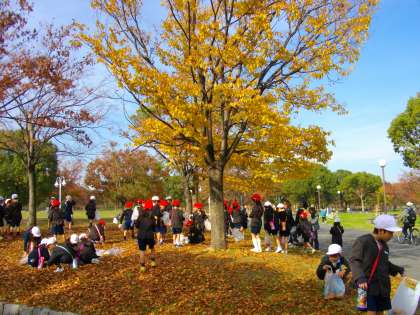 鶴見緑地公園の別のところに行ってさがすと、どんぐりや落ち葉がたくさん落ちていました。子どもたちは赤や黄色の落ち葉、穴のあいた落ち葉、そして大きなどんぐりや小さなどんぐり、ながいどんぐりやまるいどんぐりなど、ふくろにいっぱいつめていました。