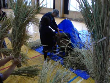 11月22日(木)、ボランティアの林さんにご指導いただきながら、5年生が稲の脱穀体験をしました。6月の田植え、10月の稲刈りに続き、今年もたくさん実った稲穂を、昔ながらの農具(千歯扱き・せんばこき)を使って、みんなで脱穀しました。都会に住む子どもたちには、とても貴重な体験でした。