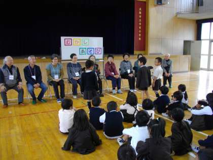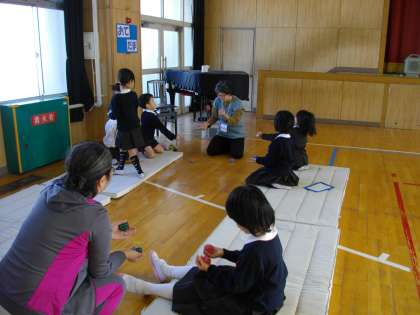 12月4日(火)2限目、1年生は体験学習として、地域の皆さま方(10名)のご指導で、「昔あそび」をしました。