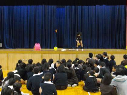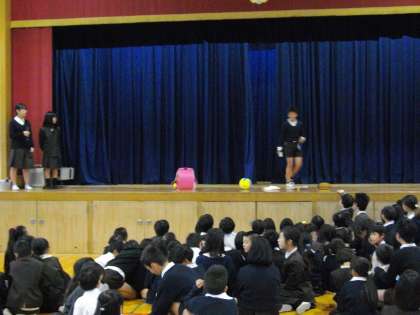 本日は、「もの当てクイズ」をやりましたが、これは講堂壇上の幕と幕の間に品物を投げ、一瞬見えるその形を判断して、その品物の名前を当てるというゲームです。