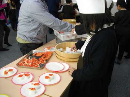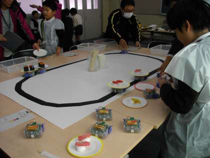 最後の写真は、動画でないのでわかりにくいですが、事前にプログラミングされたロボット(車)が黒い線の上を自動走行していて、その上にお皿のせ、注文された「おすし」をお客(児童や先生など)のところに運んでいます。