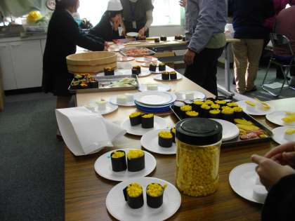 机に並べられている「おすし」は、本物そっくりですが、すべて自作のものです。