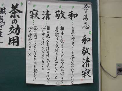 この言葉の意味は、「みんななかよく、おたがいをうやまい、きよらかで、しずかな」気持ちで、お茶を楽しむということです。
