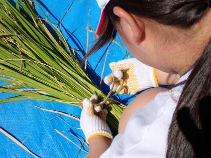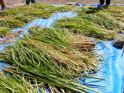刈り取った稲は、ひもで結んで稲束を作っていきました。ここでもボランティアの方に教えていただきながら、みんなで手際よく稲束を作っていました。そして、稲を乾燥させるために、はさ掛けに1束ずつ掛けていきました。しばらく乾燥させた後、脱穀体験をする予定です。