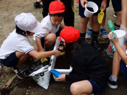 1・2年生は、11月5日(水)の1時間目に実施しました。今回も管理作業員さんからの説明をしっかり聞いて、作業を始めました。一人ひとり鉢に植え、プランターはみんなで協力して土を入れ、球根を植えました。最後にお水もしっかりあげてくれました。