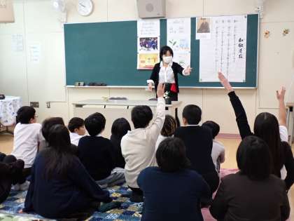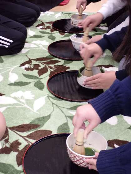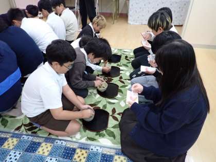 11月20日(木)、地域のボランティアの方々に来ていただき、茶道を体験しました。茶道の始まった歴史やお茶の効能、また、茶の湯の心の「和敬清寂」についてもお話しいただき、お茶やお菓子を頂く作法についても教えていただきました。