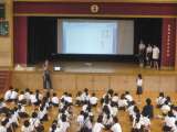 城東区の安全パトロールの皆さんに来ていただいて、児童朝会のあとに、安全に過ごすた...