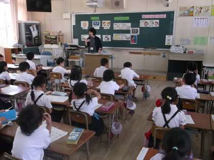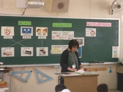 本日5月30日(木)に1年生2学級で各々栄養指導が行われました。栄養教諭の方を講師として招いて、給食を食べる時のマナーや食器の後片付けについて学習しました。