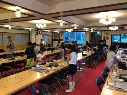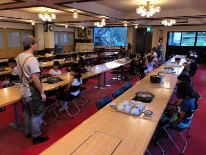 夕食前、生活班の食事係の子ども達が係の仕事の説明を真剣に聞いていました。