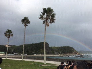 小雨の中、集合写真を撮る途中に虹が現れました。