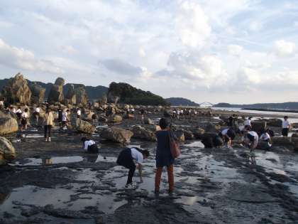 今年は、トルコ記念館(明治期に串本沖で難破したトルコ船籍の乗員を、串本の村民が献身的に救援手当した事を記念して建立された。イランイラク戦争時、日本人救出のためトルコ国が脱出飛行機を出してくれた。)が改修工事中のため見学できなかったので、本州最南端の潮岬で水平線を確認し、橋杭岩の磯で磯生物を観察しました。