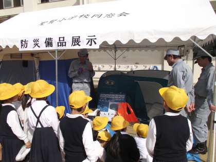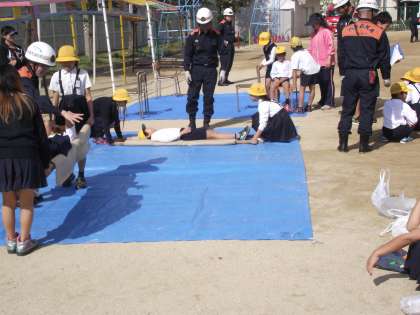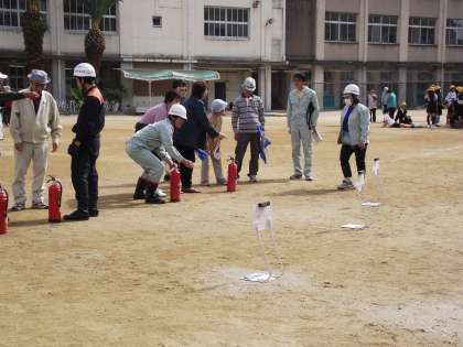 区役所物資説明と水消火器訓練、毛布と棒での担架作成訓練