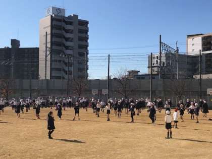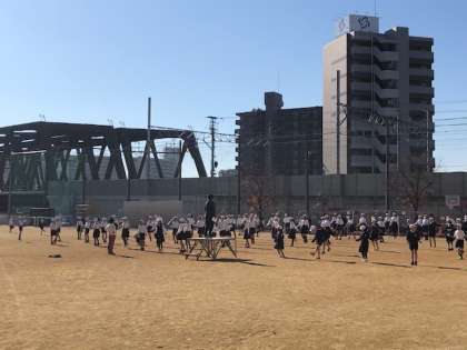 15分休みに、低、中、高学年と分かれて、毎日なわとびの練習を行なっています。