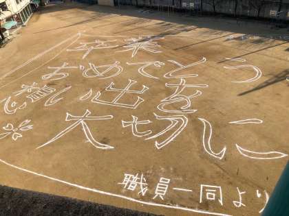 例年は、在校生と保護者、教職員による花道を作って卒業生を見送るのですが、在校生の参加が不可だったため、校庭に教職員によるサプライズでメッセージを作成しました。写真がこちらです。