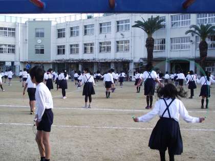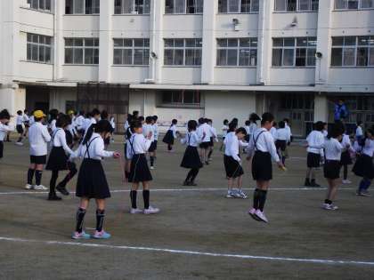 今朝(12月9日)は、高学年の「なわとび集会」です。前跳びやあや跳びやいろいろな跳び方で跳んでいました。