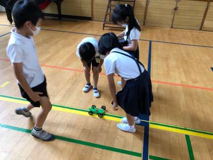 ?今日は、理科の学習の「風とゴムの力のはたらき」のゴムの力のはたらきについて、ゴムを伸ばす長さを変えると、物を動かす力のはたらきはどのように変わるかというテーマで実験をしました。