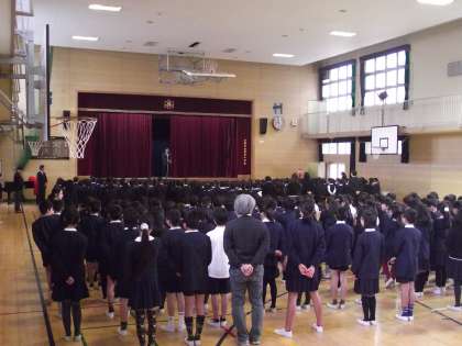 3学期がスタートしました。体育館に全員集まって、新年のあいさつをした後、学校長や生活指導の先生の話を聞いた後、元気に校歌を歌いました。