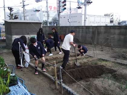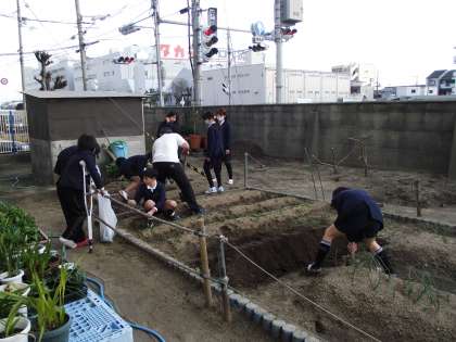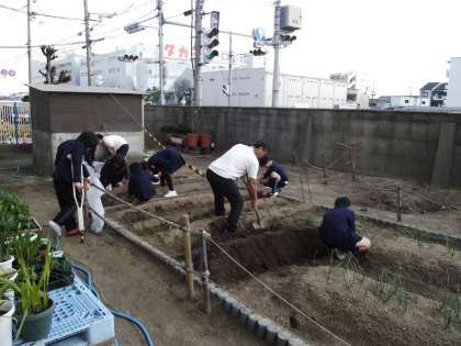 栽培委員会のメンバーが、聖護院蕪の植え替えや間引きをしています。