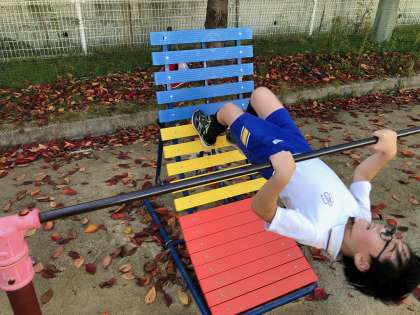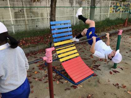 鉄棒の学習で、今年度購入した逆上がり補助器を使って練習に励んでいます。