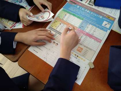 銀行からいくらお金を借りるのか、どんなお店を買うのか、どこでお金を使うのか等、グループで相談しながら楽しく学習しました。この活動を通して自分で選択する事の大切さと難しさを感じる事ができました。