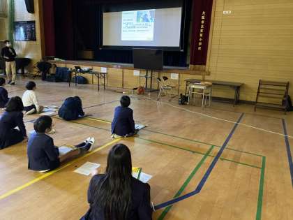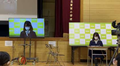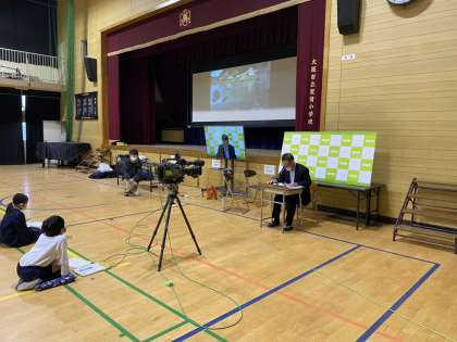 また、事前にオーディションを行い各クラス3名ずつアナウンサー体験を行いました。練習した甲斐があり、上手にニュース内容を伝えることができていました。