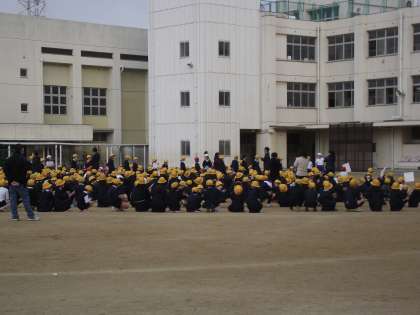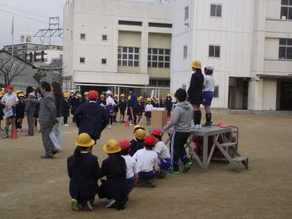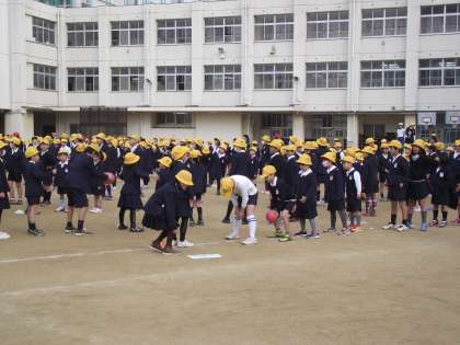 今日は、6年生が卒業遠足でいないので、5年生の集会委員がリードをとって頑張りました。各グループごと(縦割り,異年齢集団)で「ボール送り」ゲームです。