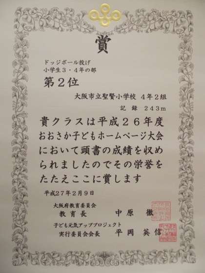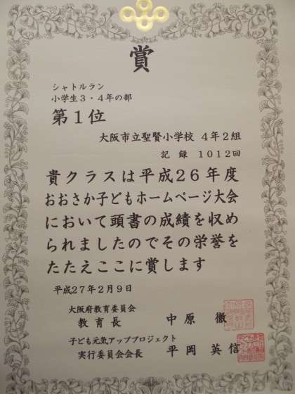 「おおさか子どもホームページ大会」で、賞状をいただきました。