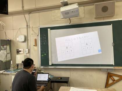 2年生は、算数のひき算の筆算(くり下がりあり)のしかたのパワーポイントを活用して学習しました。