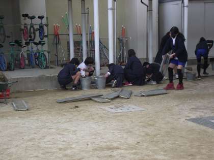 6年生の皆さんが、長年お世話になった校舎や運動場にお礼を言うために、清掃活動に励みました。トイレ掃除や、運動場の側溝にたまった土取りや、いろいろ頑張りました。