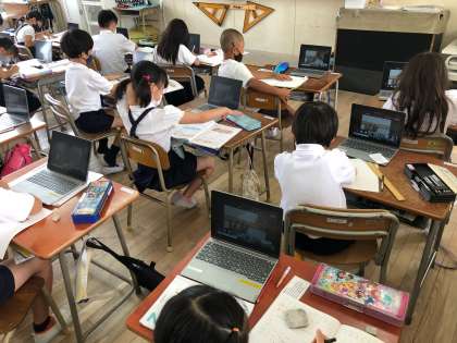 2年1組では、算数の学習でタブレットを活用して、直線を引く練習に取り組みました。