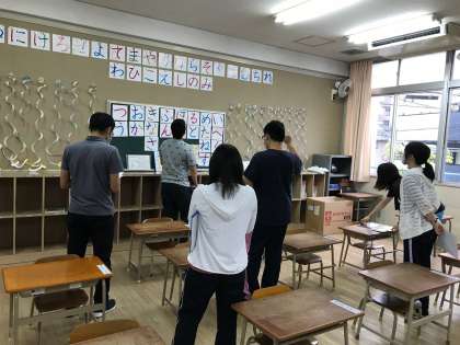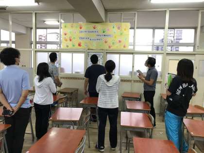 放課後、教員間で研修を行いました。今回は、各学級の掲示物や当番表などを見て回り、良さや工夫を交流しました。
