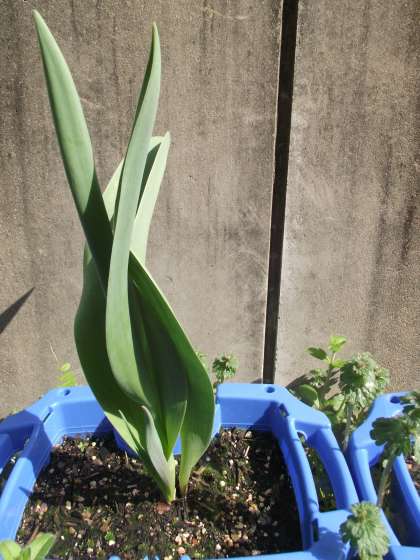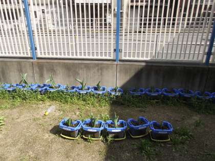 1年生が世話をして育てているチューリップ(人権の花:大阪法務局より)がグーンと伸びてきました。来月の入学式には、可愛い花が咲くかな?