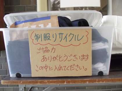 標準服リサイクルにご協力いただきありがとうございます。今は、玄関を入ったところにボックスを置いておりますので、そこに入れて頂ければ助かります。