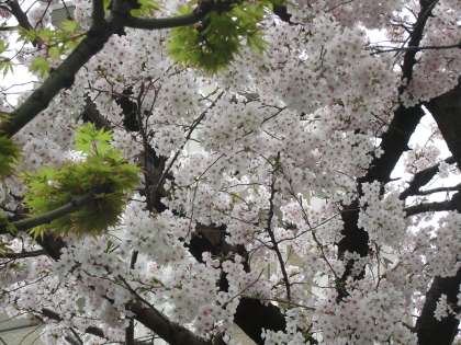 雨で4月が始まりました。正門横の桜は今が盛りです。