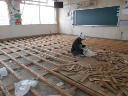 老朽化した床工事が始まりました。今夏は5・6年生の教室です。2学期からピカピカの床で勉強に励みましょう。