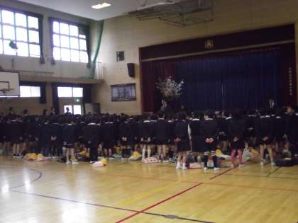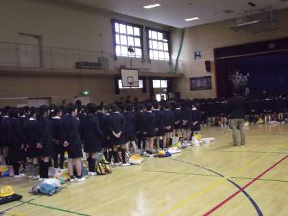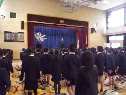 1年生は教室で学習ですが、2〜6年生は、体育館で「始業式」を行いました。