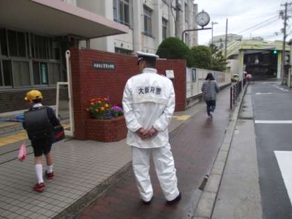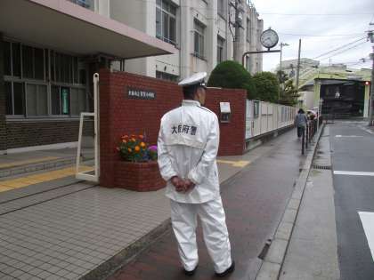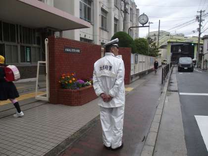 お巡りさんは、今朝は正門の所で子どもたちを見守ってくれました。自動車が停車して、信号の無い横断歩道を渡った時は、ドライバーさんに「礼」をしましょう。そうしたら、また止まってくれるからねと、子どもたちに教えてくれました。