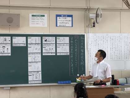 5年2組で国語科の説明文「和の文化を受けつぐー和菓子をさぐる」で、みんなの考え方を比べて、資料の効果的な使い方を考えました。「主体的・対話的で深い学び」につながるような、活動を5年1組とともに考えて活動してきた成果を、各学年の先生方が参観しました。子どもたちはグループで意見を交流し、学びを深めていました。
