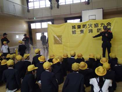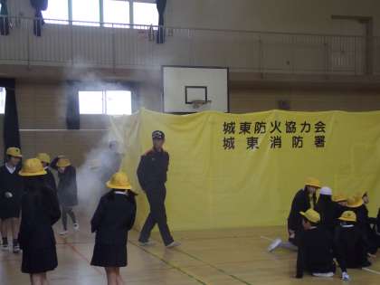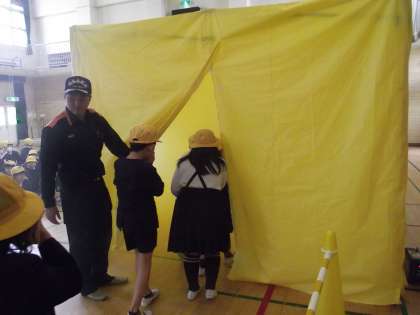 全学年はできないので、今日は3年生と6年生が、「煙中訓練」をしました。テントの中は簡単な迷路です。