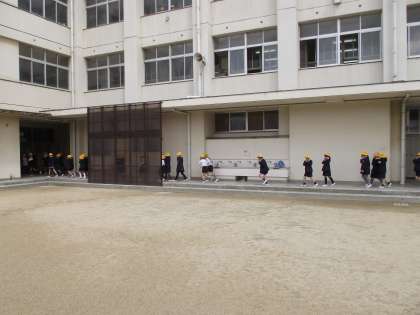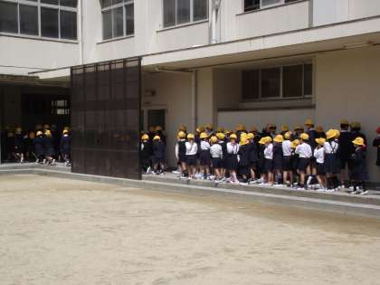 今日は、城東消防署の方に来ていただいて、「家庭科室」から出火の想定で避難訓練をしました。帽子をかぶって、ハンカチで口をおおって、「おかし」(押さない、駆けない、喋らない)の合言葉で、上手に体育館まで避難できました。