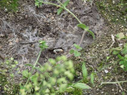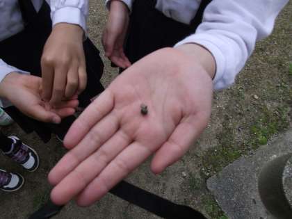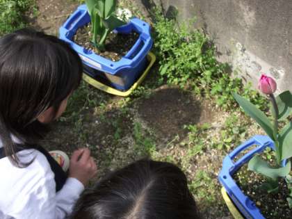 チューリップの世話をしていた2年生の女の子たちが、「だんご虫やでえ。」と見せてくれました。幼虫もミミズもいてるで。と鉢を動かして教えてくれました。