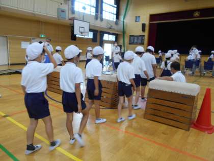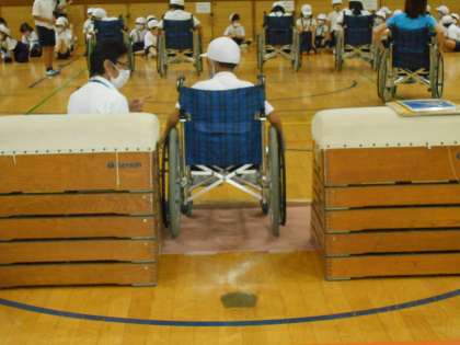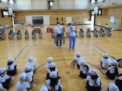3年生が「総合的な学習の時間」で車いす体験学習会を行いました。リハビリテーションセンターの方々に車いすの部品、基本的な説明を教えていただきました。また、講堂の中に設置したコースを最初に歩いて回り、順番に車いすで自走しました。