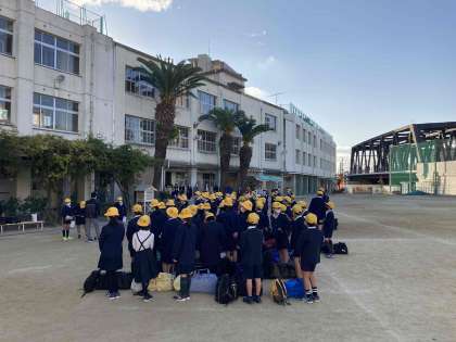 少し寒いですが、晴れ。1泊2日の自然学習の始まりです。