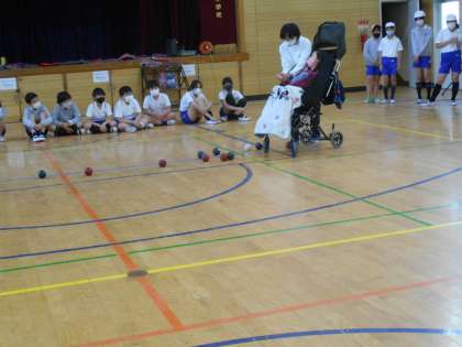 特別支援学校、大阪府立光陽支援学校の児童と6年1組の児童が、交流しました。まず教室で「どんな学校なのか」、一日の様子など話を聞きました。そして、講堂で「聖賢ソーラン」を披露。いっしょにできるボッチャを楽しみました。