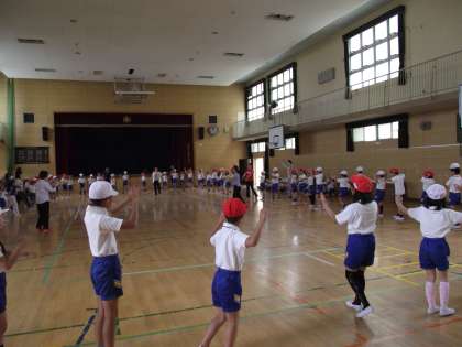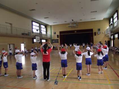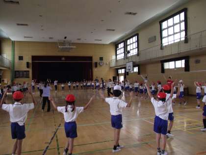 今日から、運動会(6/7)で子どもたちが披露する「聖賢音頭」を順番に地域の先生に指導していただきます。今日は2年生と4年生です。