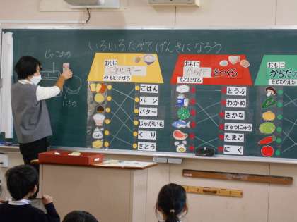 1年生の栄養指導がありました。黄、赤、緑の食べ物について考えました。