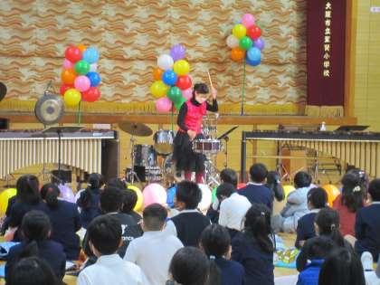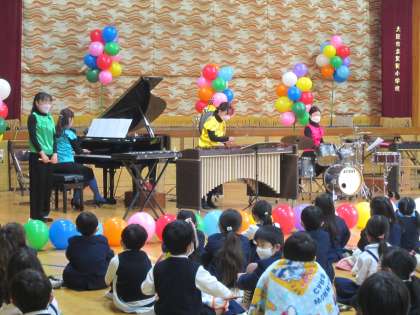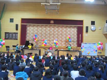 オーケストラ、吹奏楽、ソロなどで活躍するプロの演奏家4人の「cache cache(カシュカシュ)」による、マリンバ・パーカッション&ピアノの演奏を楽しみました。客席から見える楽器のほか、多数のかくれんぼしている楽器に歓声が上がりました。